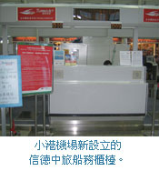 除在台灣設置櫃檯外,信德中旅船務更將飛機與船連結在一起,旅客搭機前往香港後,只要循指標前往信德中旅船務櫃檯辦理登記手續後,即可從機場轉搭免費接駁車前往碼頭,行李會直接轉往目的地,減少海關檢查次數,形成「飛機與噴射船連結成一體的一線式」服務流程。