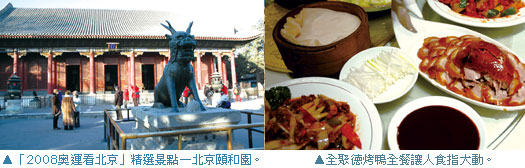 此外,帶領遊客臨奧運主會場鳥巢與泳賽主場水立方的外觀巡禮,也是產品重要賣點,在「2008奧運看北京.承德.天津溫泉美食8日遊」部分會再加進承德避暑山莊、小布達拉宮探訪,天津安排天后宮、食品街、古文化一條街及租界文化區遊歷的動線,為行程再添深度與廣度。風味餐食的部分,全聚德烤鴨、東來順涮羊肉、百餃園餃子宴、漢慈堂藥膳…全是行程中安排的珍饈美膳,一網打盡北京與天津美食,讓遊客大飽口福。