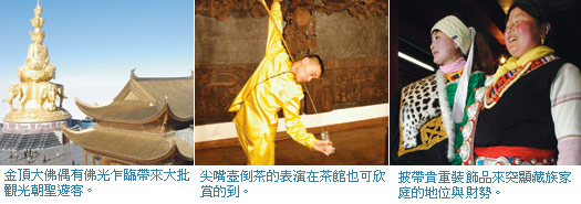 氣象萬千的峨眉山臥雲浮舟、冷杉幽林無處不引人入勝,加上原為普賢菩薩道場,被譽為中國四大佛教聖地之一,近2000年的佛教發展歷程,為峨眉山留下了豐富的佛教文化遺產,著名的有報國寺、伏虎寺、萬年寺…等座落於此,其建築、塑像、法器、禮儀、音樂、繪畫在在展示出宗教文化的濃鬱氣息,「2005年度中國最具影響力十大旅遊品牌」的評選中,峨眉山風景區以第一名獲獎景區的優勢在四川峨眉線旅遊的推動上,吸引了眾多愛好峨眉文化的遊客,帶動入境旅遊更顯功不可沒。
