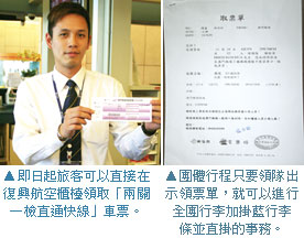 如今,直接在櫃檯領取車票辦理直掛就可免除這般不便,團體部分,全團旅客無須擔心領票的相關事宜,只要領隊出示領票單,就可以進行全團行李加掛藍行李條並直掛的事務,沒有個別領票的繁瑣步驟,旅程更是輕鬆快捷。