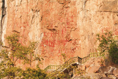 花山崖原始壁畫位於廣西寧明縣明江流域的懸崖峭壁上,全面都是採用朱紅色的顏料所畫成,雖已經歷多年的風吹日曬雨淋,但是直到現在仍有1,000多個畫像可以清楚看見, 2004/10政府下令禁止遊客近距離的觀看,以防壁畫受到破壞,為此政府也規劃在壁畫附近建造觀景台,讓遊客可在適當的距離觀賞奇特的圖樣,目前仍是以搭船欣賞壁畫為主流。其畫中人物千奇百態,令人好奇的是,這些壁畫創作自哪個朝代?又是如何畫上去的?目前仍然是個解不開的謎團。而住宿「廣西花山民族山寨」體驗壯族人能歌善舞的熱情,也是團體行程中唯一入住的度假村。