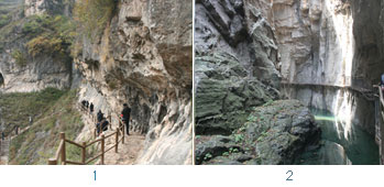 1.旅客們走在青龍洞大峽谷沿著山壁的蜿蜒小徑。
