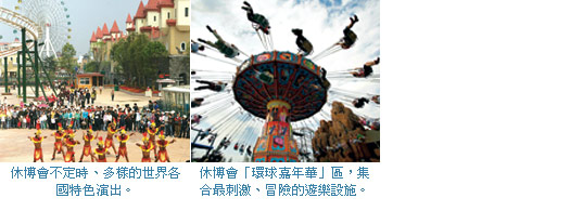 環球嘉年華:引進環球嘉年華全套遊樂專案,此為展區內最具冒險、刺激的大型遊樂設施,主要分佈在中心區與遊樂區,包括:彈射式蹦極、急流漂進、青蛙跳、老鼠也瘋狂、瘋狂毛蟲、飛天椅、摩天輪…,一個個名字無不帶點心驚肉跳的色彩,而杭州環球嘉年華玩的就是刺激。