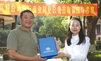 北市旅行公會大陸委員會副召集人李逸致贈禮物給江北區旅遊局副局長吳易凝(右)。