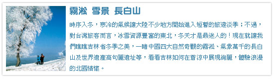 吉林霧淞與黃山雲海、泰山日出、錢塘江潮並稱為中國四大氣象奇觀,是吉林得天獨厚的特色景觀,每年大約11月下旬至翌年3、4月,水汽凝結在柳樹松針上,沿江的垂柳掛滿了潔白晶瑩的雪花,霎時天地間一片雪白,置身其中,宛如在銀色童話世界一般,是遊客絕不能錯過的美景。 另外,滑雪也是東北三省冬季熱門旅遊主題,吉林有多處優質滑雪場,包括北大湖滑雪場、距中心城市最近的長春蓮花山滑雪場、長春淨月潭滑雪場、朱雀山滑雪場...等, 都曾經舉辦過大型滑雪賽,軟硬體設施具有國際級的水準,提供滑雪同好享受雪上奔馳的暢快感受。