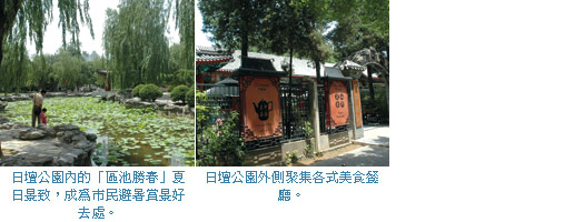 1951年北京市人民政府將日壇擴建為占地20餘公頃的日壇公園,成為北京著名的都會公園。公園周邊則是西餐的天下,且聚集多家俄國餐廳,其中位於公園北門日壇北路上的「大笨象」最受讚譽,另外,公園南門義大利菜「翡冷翠」、中餐廳「羲和雅居」皆是老饕青睞的好去處。日壇公園另一個賞心悅目的景致,就是在此周遭上班、衣冠精緻的白領階級,此處由於環境清幽,以及使館區的治安,吸引社會菁英與文藝界人士前來,加上使館區工作的國外職員,在此形成濃郁不散的異國風情。