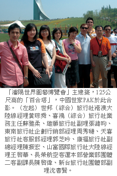 「2006中國瀋陽世界園藝博覽會」,從今年5/1~10/31展出,可說是今年東北最亮眼的盛會之一,開園至今累計參觀人數突破500萬人次,整體評價不俗。旅客在此約有3小時參觀時間,並安排園區2段電瓶車接駁,以節省時間避免太過勞累。園區中以「玫瑰園」最受旅客歡迎,溫室造景花園培植3,000多種、10,000餘株世界最大的玫瑰園,當中並有一株由黃金打造成的玫瑰樹,為客人留影的首選。在造景上,園區主要建築「百合塔」高125公尺,是世界上最大的雕塑體建築;「鳳之翼」為入園正門主題象徵,高72公尺、面積4,168平方公尺,結合了展覽的精神與工藝之美感。