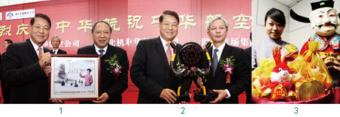 1.華航總經理孫洪祥致贈華航武漢首航紀念品給湖北省政協副主席陳春林(右)。 2.武漢市人大副主任彭志敏(右)致贈紀念品給華航總經理孫洪祥。3.華航致贈首航班旅客喜氣洋洋的兔子玩偶與百年金幣巧克力。