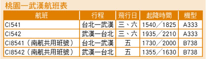 武漢台資企業近2,200家,包括富士康、冠捷電子、中芯國際等廠商,都是主要的貨源。華航桃園—武漢使用A333機型,除了可提供36席商務艙及277席經濟艙的載客服務,腹艙亦可載貨10~12噸。桃園—武漢前 2班平均載客率達9成以上,預估未來全年度平均可達80%以上,再加上貨運營收,華航對該航線深具信心。此外,華航也與南航在該航線進行共用班號服務,另增加週五航班,總計提供桃園—武漢每週共3個班次的往返。