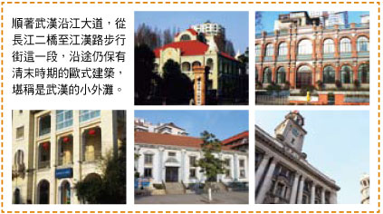 全長約1555公尺的江漢路,曾被形容「車馬如梭人似織,夜深歌吹未曾休」,現在還有許多30年代遺留下的西方建築。目前江漢路仍是漢口最繁華的區域之一,超過400家商店,有些更是30~40年代的老字號店家,包括國父孫中山題字的精益眼鏡店、台灣銀行武漢分行(現為中國人民銀行)。