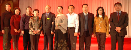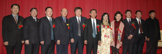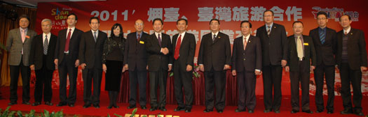 ▲(左起)新玟明旅行社總經理陳伯三、東一資產管理公司董事陳義豐、煙臺市人民政府副秘書長張煥偉、煙臺市旅遊局局長尹國文、台灣山東同鄉會總會長秦慧珠、中華團結自強協會理事長汪元仁、煙臺市人民政府副市長李樹軍、志洋旅行社董事長蕭志洋、前交通部觀光局副局長郭蘇燦洋、前彰化縣旅行公會理事長王永欽、煙臺市台辦主任孫迎軍、前台中縣旅行商業同業公會理事長林隆基、華航台北分公司客運營業部香港線╱大陸線主任宋道明、華航台中營業處主任許德聰。
