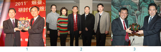 1.煙臺市政府副市長李樹軍(左)與志洋董事長蕭志洋互贈紀念品。2.(左起)煙臺市旅遊資訊服務中心副主任吳濤、煙臺市旅行社協會會長王美玲、志洋董事長蕭志洋、煙臺市旅遊局副局長牟雲╱市場開發科曹陽。3.煙臺市旅遊局局長尹國文(右)與志洋旅行社董事長蕭志洋互贈紀念品。