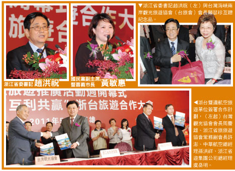 談到兩岸觀光互動,趙洪祝表示浙江在 1987年開始接待台灣觀光客,當年只有3萬7 千多人次,後來每年以15%成長,到去年已有128萬多人次,而去年浙江民眾到台旅遊也有18萬,兩地互動、參訪、旅遊已然形成良好局面。而國民黨副主席黃敏惠致詞時,則期待浙江民眾多到南台灣旅遊,此外,也呼籲高雄兩岸直航班機數量能夠增加。