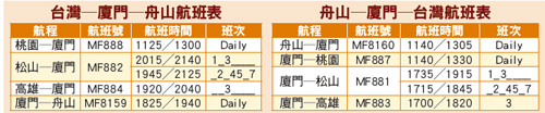 目前廈門航空提供桃園─廈門的Daily航班,以及每週一、二、三、四、五、日的松山─廈門航班,還有每週三的高雄─廈門航班,藉廈門作為中轉點,連結舟山。在中轉過程之中,廈門航空並提供了機場專用中轉休息室、免費茶水、機場候機樓 50RMB消費券,針對團體旅客,並將由廈航國旅提供廈門半日遊行程,隔夜中轉旅客也可獲得免費住宿,兼具行程舒適度與豐富性。