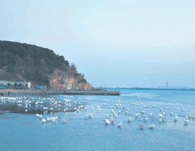 天鵝湖面積5平方千尺,東南兩面瀕臨黃海,西北與陸地相接,為世界上幅員廣大的天鵝越冬棲息地之一,一碧萬頃的湖水與偏偏起舞的天鵝,構成一幅幅天然畫作;時不時傳來的雄渾長鳴,譜寫成一首首天鵝暢想曲。