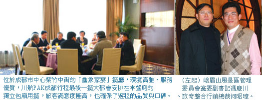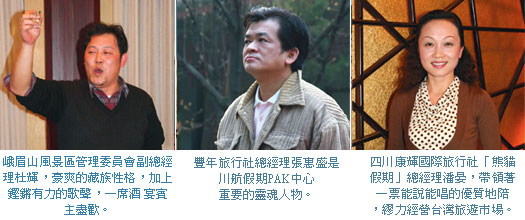 ▲川航假期PAK去年操作成績斐然,一行團員受到峨眉山風景區管理委員會的熱情接待。(前排左起)豐年旅行社總經理張惠盛、四川航空市場營銷管理部副總經理胡平舒、峨眉山風景區管理委員會副總經理杜輝、凱行旅行社董事長陳信豪、峨眉山風景區管理委員會市場營銷部副部長黃錦秋;(後排左起)四川康輝國際旅行社總經理潘晏、TNN911旅遊新聞網執行長林念平、四川航空市場營銷管理部國際業務經理余波、信安旅行社董事長蔡向忠、百順旅行社董事長王國輝鄉野旅行社總經理宋弘原。