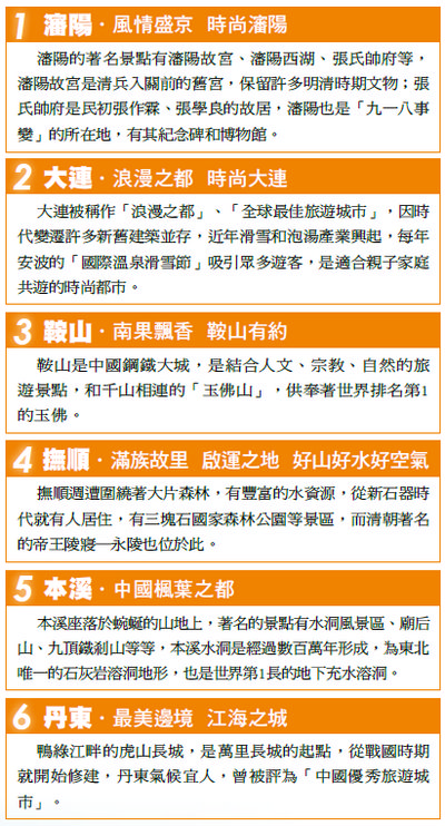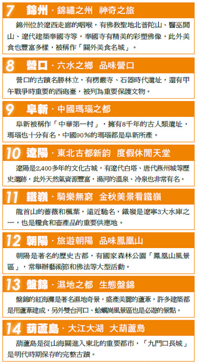 遼寧有14個城市,除了瀋陽和大連2個副省級市,其他再由12個地級 市組成,國家級景區有鞍山千山、鴨綠江、旅順口等多座;瀋陽 故宮也是國家歷史文化名城,不論是歷史巡禮、泡湯賞雪、品嚐美食, 都能在遼寧獲得滿足。