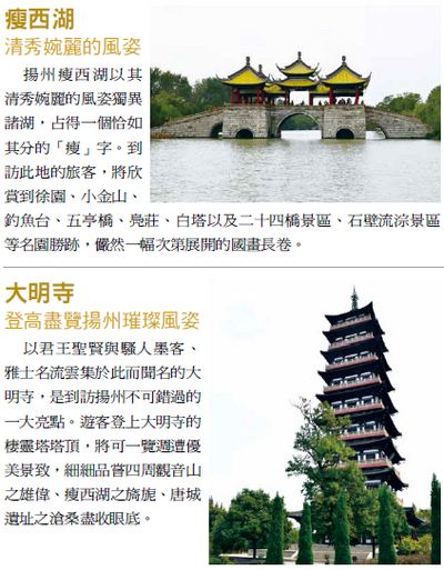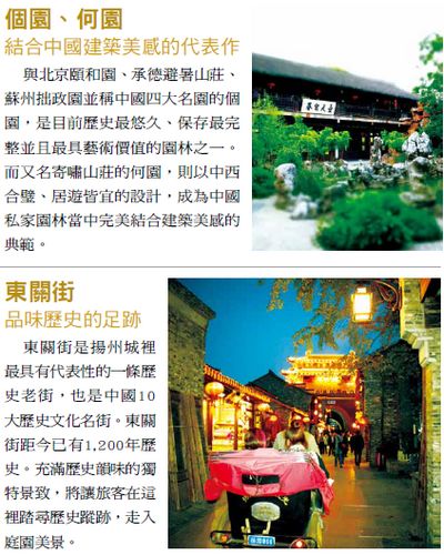 擁有無數美麗景致的揚州,是大陸首 批24座歷史文化名城之一,旅客於此 可以感受到秀美的自然風光、獨特的 園林古蹟、獨特中顯露璀璨的文化藝 術,以及精緻的美味佳餚,盡在這個 古都之中。