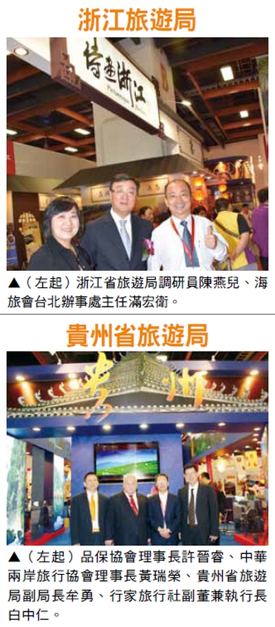 台北辦事處主任滿宏衛表示,今年 為進一步提升台北旅展的專業化、市場 化並鼓勵參展商持續努力,組委會共設 置「最佳組織獎」、「優秀組織獎」、 「最佳展台獎」「優秀展台獎」、「最 佳銷售獎」、「優秀銷售獎」和「特殊 貢獻獎」7個獎項。其中,銷售獎是首 次因應展銷合一的規劃而推出。特殊貢 獻獎則頒贈給財團法人台灣觀光協會, 由張學勞代表領獎。本次展覽中,江 蘇、廣東、福建、上海、浙江、山東、 貴州、國航等7個單位名列最佳組織、 最佳展台與最佳銷售,充分展現對台行 銷的用心。