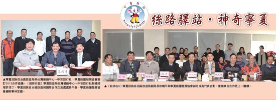 2014/12/31由寧夏旅遊局副 局長徐曉平召開,寧夏旅遊局與台 北寧夏(夜市)商圈發展協會合作 座談會,希望推廣寧夏獨具特色的 旅遊目的地的鮮明形象,吸引更多 台灣遊客到寧夏旅遊,雙方並簽署 合作協定,建立管道,以期達到互利共贏 的成效。
