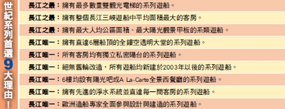 中國內河豪華遊輪的第一指標─世紀遊輪,全系列採用國際5星酒店管理服務,且全面為江景露台房,旅客在房內便能享受三峽的壯闊美景,精緻奢華的體驗,深受市場歡迎。今年世紀遊輪推出眾多超值優惠,要與同業再創銷售顛峰。