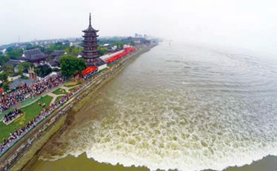 觀錢塘江大潮,品千年古城鹽官!位於 浙江北部的海寧市,是良渚文化的發 源地,境內擁有海寧潮文化、燈彩文化、名 人文化,因地居錢塘江河口北岸,每年前往 觀錢塘江大潮的遊客就有可觀人次。錢塘江 大潮,又稱「海寧潮」,是世界最大的天文 大潮之一,與亞馬遜河、恆河並列為世界三 大強涌潮河流。北宋詩人蘇東坡曾經對錢塘 江秋潮留下「八月十八潮,壯觀天下無」的 讚嘆,所以農曆八月十八前後也是觀潮的最 佳時節。