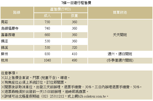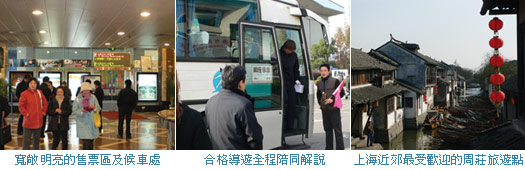 「上海旅遊集散中心」是以上海為中心輻射至周邊旅遊景點,推出100多條景點,安排1~4日不同天數行程,並搭配汽車、火車、輪船等交通工具。特別是對於行程有清楚規定、品質要求,以及通過ISO9001驗證等保障,看準以上這些規範嚴格把關前提之下,北極星旅行社才安心取得台灣獨家代理權。