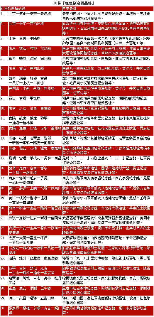 目前實際規劃出,中國「12個重點紅色旅遊區」:滬浙、湘贛閩、左右江、黔北黔西、雪山草地、陝甘寧、東北、魯蘇皖、大別山、太行山、川陝渝、京津冀;以及配套的30條「紅色旅遊精品線」,重點打造出100個左右「紅色旅遊經典景區」。目標致力於將100個景點,80%以上達到國家旅遊景區AAA級以上標準,其中40%要達到AAAA級標準。到2007年,將極力發展讓其中50個「紅色旅遊經典景區」,年接待規模達到50萬人次以上;2010年,80個景區年接待規模皆達到50萬人次以上。