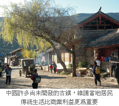 因此,中國目前對於古鎮開發,最初開始不是以旅遊為主,而是先保護文物、先作規劃,區隔重點保護區,盡可能原汁原味地保存歷史遺蹟,對於已經遭破壞的,從古籍資料中尋求根源,保存它的古味而將其修復。在軟體方面,當地居民的生活實際上也是一種文化、歷史,也必須把它保存下來,盡可能順其自然不矯作。而旅遊肯定會有商業,因此重新規劃專門商業街區。此外,在景點區域中,把一些不符合古城的房子搬出去,讓老百姓在古鎮開發中不但不受損,還會得到補償改善生活。