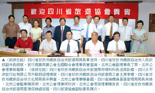 四川省甘孜州藏族自治州人民政府與旅遊局於6/27拜會台北市旅行商業同業公會,甘孜州副州長胡斌獻上「哈達」表達尊敬之意,並由曾盛海與丁萊共同接受,象徵雙方的誠摯合作。丁萊表示,四川省的旅遊一直表現良好,現在要擴大到甘孜州,將有助於旅遊業者包裝出更多特殊的行程。