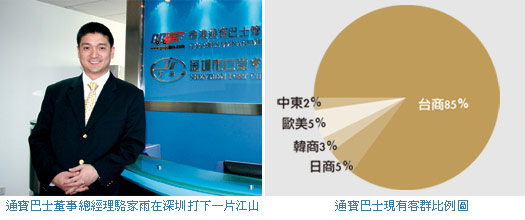 而針對船運提出的「行李直掛」服務,駱家雨表示,「那除非住在蛇口或福永碼頭,否則還是要轉車。」也因此「door to door」的服務,是通寶巴士亟欲建立的的獨特服務,「未來巴士加小車是主流,通寶巴士路線多、班次密、便利性高,甚至可以做到踏出台灣家門口的時就派車接送,這也是我們目前正在談的。」擴增服務的據點、活化大小車的調度,是現階段通寶服務的真章。