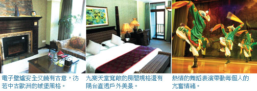 武俠小說大師金庸先生造訪九寨天堂後曾說過,「到了九寨天堂後,方知人間有天堂。」九寨天堂國際會議度假中心由7棟呈扇形排列的建築組成。有客房1,100間,房內還有有電控壁爐,讓遊客不僅美景環繞亦有豪華享受之趣,於此九寨天堂國際會議度假中心總經理何德偉表示,加深住客與自然的互動是九寨天堂與其他飯店最大的分野,住客即使走進大廳、踏入房間,都有林蔭綠意的美景環繞,近期也將開放仕女樓層接待粉領團或隻身旅遊的遊客,讓飯店服務的領先腳步更邁向前。