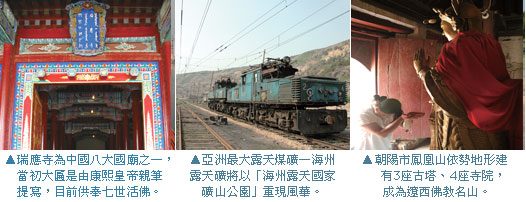 「藏傳佛教」並非西藏特有,在遼寧省也能領略其獨特魅力,被譽為「藏傳佛教東方傳播中心」的阜新市,就擁有中國8大國廟之一的「瑞應寺」,原來大匾是由康熙皇帝以滿、蒙、藏、漢等4種文字親筆提寫,他並封當時該寺的一世活佛為「東方蒙古老佛爺」,該寺崇高地位於是建立。目前瑞應寺供奉七世活佛—察罕殿齊.洛桑.義希成來堅措,他在1997年10月9日坐床,之後積極化緣籌措資金,大興寺廟建設,由於今年屆滿七世活佛坐床10週年,阜新市旅遊局也規劃系列慶祝活動,讓信眾同享佛光歡喜。另外,海棠山上數百座摩崖石刻佛像,登山同時見證修行者的鬼斧咫u,更讓路途充滿祥和。