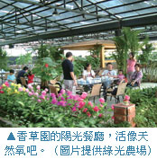 早餐是在香草園吃的。香草園如其名,真的很綠色。整個餐廳裡面種著鮮花和綠色植物,大小盆景錯落有致的擺放著,藤製的桌椅古樸別致。全玻璃構建的餐廳最浪漫的設計就是其屋頂,每當夜色降臨的時候,香草園的屋頂天幕就會打開,你可以坐在餐廳裡,一邊喝著香草茶一邊仰望蒼穹。