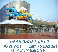 老虎灘海洋公園、老虎灘極地館為大連市贏得一個全國旅遊界的「鑽石級榮譽」—「國家5A級旅遊景區」。為此,國家旅遊局副局長張希欽與大連市市長夏德仁日前連袂同賀,將「國家5A級旅遊景區」牌匾頒發給大連老虎灘海洋公園總經理趙文敬,張希欽在頒牌儀式上代表國家旅遊局祝賀老虎灘海洋公園、老虎灘極地館得到這項殊榮。國家旅遊局規劃發展與財務司司長吳文學也宣讀國家旅遊局相關通知,大連老虎灘海洋公園、老虎灘極地館與故宮等66家景區景點一起被評為我國首批「國家5A級旅遊景區」,隨後,中央電視台「中國音樂電視」率領當紅藝人在老虎灘舉行演唱會,歡慶大連旅遊界此一盛事,並答謝市民朋友對老虎灘景區的厚愛。國家旅遊局、遼寧省旅遊局有關負責人,大連市領導林慶民、懷忠民、魏小鵬、劉長德、孫廣田、田樹軍、王業濱等貴賓參加頒牌儀式並共同觀看演唱會,場面熱烈非常。