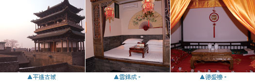 ◆仿古客棧 平遙古城的客棧可說是將全球吹起的「民宿」風發展得更極致,直接將明清時期建築改建成為同時保有傳統臥躺的「炕」與古樸的床閣,又備有暖氣、電視等舒適設備的一流仿古客棧,其中雲錦成與德盛樓是當中最首屈一指的客棧。雲錦成隸屬平遙國際金融家俱樂部有限公司,是當地唯一5星級民居客棧,共有62間客房,分為標間、套房與總統套房等。同樣擁有60餘間客房的德盛樓,是一棟二折三進的兩層綉樓建築,院中還有一個傳統戲臺,饒富風情。