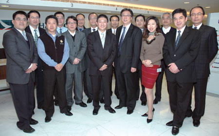 ▲(左起)北航旅行社台北分公司經理鍾建綱、協益旅行社副總楊文彬、國裕旅行社副總經理劉裕鴻、大都會旅行社協理黃聖承、福洋旅行社總經理唐福、南龍旅行社團體部經理葉太平、浦東旅行社總經理馬效山、雄峰旅行社總經理施懿、國泰航空客運業務副理劉經綸、北區業務經理陳志智、五福旅行社經理林齊棟、港龍航空業務主任童麟麗、凱旋旅行社副總經理許定國、東南旅行社大陸旅行事業本部協理黃國軒與南龍旅行社總經理沈正發。