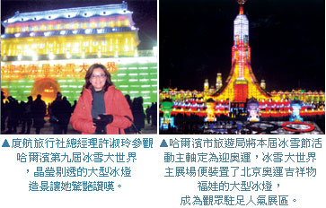 許淑玲表示,冰雪節是東北地區冬季的一大盛事,廈航旅行社一直致力於推廣東三省的旅遊活動,此次冰雪節除參與開幕外,並與黑龍江省台辦、哈爾濱市旅遊局會面,共同討論推廣東北三省的旅遊計畫,以利未來兩岸開放觀光時,有最好的服務迎接兩岸的旅客。