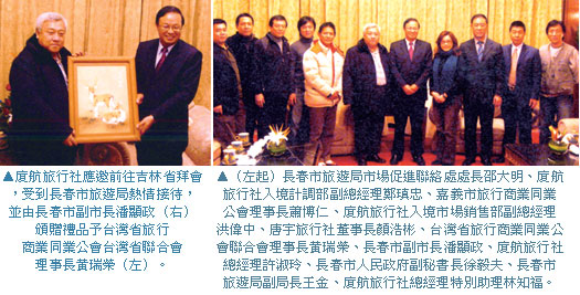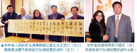 在參加完哈爾濱冰雪節開幕活動後,廈航旅行社總經理許淑玲帶著公司同事一行隨台灣省聯合會理事長黃瑞榮、嘉義市公會理事長蕭博仁、唐宇旅行社董事長顏浩彬進行東北三省考察行程,前往吉林省時,除了受到長春市包括副市長潘顯政、旅遊局副局長王金的熱情接待,吉林省台辦主任王忠仁也親自陪同品茶,下午拜會吉林省旅遊局局長于國志、副局長林天等人,為吉林旅遊交流宣傳冬季旅遊。
