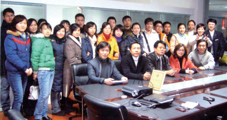 瀋陽青年國際旅行社董事長兼總經理倪琛善(前排左3)率領隊聆聽由廈航旅行社針對來台業務所進行的培訓講習。