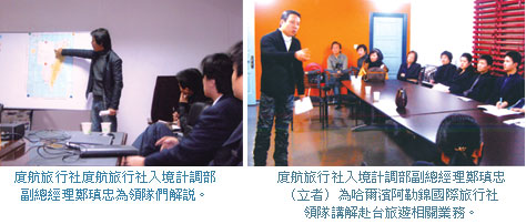 許淑玲帶領總經理特助林知福與兩位副總經理—洪偉中與鄭瑱忠,針對大陸人士來台時應該注意的事項進行講解,也介紹台灣地區旅遊景點及廈航旅行社本身的業務等等,希望藉由此次課程交流,達到相互學習的目的。許淑玲表示,「由於看好大陸人士來台的機會,因此廈航旅行社率先帶領團隊前往東北地區投石問路,一方面介紹台灣觀光旅遊,一方面將廈航旅行社介紹給東北地區的業者,達到交流與未來合作的目標。」