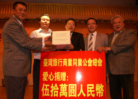旅行公會總會理事長姚大光(左1)在台灣募捐50萬人民幣,並以現金致贈四川省旅遊局長張谷(中)。四川省台辦副主任(左2)張軍、旅行公會總會創會名譽理事長曾盛海(左4)與台灣省旅行公會理事長黃瑞榮(左5)。