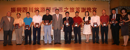 (左6)旅行公會總會理事長姚大光頒發感謝狀及禮物感謝協助震災的大陸各單位及個人。(左起)台灣省旅行公會理事長黃瑞榮、阿壩州羌族自治州人民政府台灣事務辦公室主任郭朝武、鳳凰機場機長張兵、四川旅遊局副局長吳勉,(左7起)成都市台灣同胞投資企業協會會長高錦樂、汶川縣威州鎮棋盤溝村村長王修倫、四川航空傅軍、成都市旅遊局副局長和育東、城市名人酒店集團市場營銷副總裁詹哲維、澳門航空四川地區總經理歐陽軍婕。