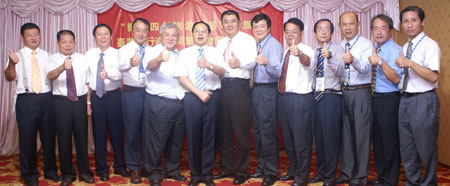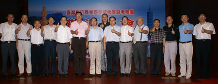 (左6)四川省旅遊局長局長張谷豎起大拇指向台灣旅行業者表示四川旅遊依舊「讚」!(左起)台中縣旅行公會副理事長張豪峰、宜蘭縣旅行公會理事長林梧桐、 北市公會監事主席莊世忠、南投縣旅行公會理事長林金和、 台灣省旅行公會理事長黃瑞榮、旅行公會總會理事長姚大光、嘉義市旅行公會理事長蕭博仁、彰化縣旅行公會理事長謝調正、雲林縣旅行公會理事長莊龍江、金瓜石旅行社董事長詹景棠、屏東縣旅行公會理事長伍天爵、台灣省旅行公會監事吳蕭明。