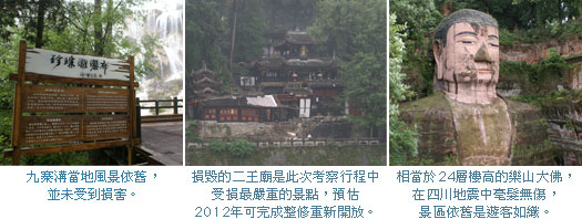 此次考察行程包括九寨溝、黃龍、都江堰、樂山大佛、峨嵋山等四川旅遊名勝,此5個重點行程是一般旅遊行程中最受歡迎的景點,經過實際考察探訪後,所有經區幾乎完好,除都江堰的二王廟毀損嚴重外,其餘景區幾乎沒有受到創傷,歷經2,000多年的都江堰水利工程也依舊完好如初,同業未來依舊可包裝四川旅遊行程。