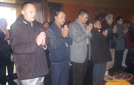 (左起)旅行公會總會大陸委員會副召集人董彬、南投縣旅行公會理事長林金和、旅行公會總會理事長姚大光、宜蘭縣旅行公會理事長林梧桐、 北市公會監事陳照明為四川地震後的四川人民與旅遊業祈福。