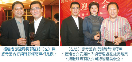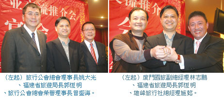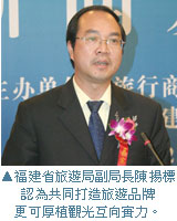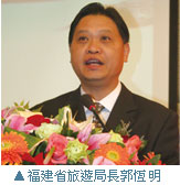 論及福建的推廣優勢,福建省旅遊局長郭恆明提到,福建地區人文薈萃、山清水秀、山海一體、閩台同根,觀光特色鮮明,2007年全省接待入境旅遊者268萬人次,較前年增長17%,旅遊外匯收入超過21億美金,較前年成長47.5%以上,整體旅遊總收入更是堂堂突破千億元人民幣大關,相當於福建省生產總值的11%。尤其2008年1~11月,福建省接待境外遊客人次超過253萬,也同比去年成長了7.2%,而台胞赴閩旅遊人次為80萬人次,亦締造了21.2%的成長紀錄,在中國各省入境旅遊普遍下滑的此時,福建還能逆勢成長實屬難得,也感謝台灣業者與相關單位的大力支持。