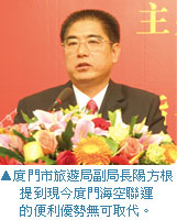 針對廈門市場的發展,廈門市旅遊局副局長陽方根提到,福建與台灣的觀光合作相較於其他旅遊區塊或省分,有著許多他地難以比擬的優勢。2001年起,廈門與金門建設了小三通模式,且廈門與台灣本島間也有了節日包機的落實,後來陸續開展了福建居民可以經廈門口岸到金門與澎湖進行旅遊活動的政策,互向交流越趨熱烈。迄今,已經連續4年舉辦海峽旅遊博覽會,為推動兩岸旅遊的全面合作,進行了富有成效的探索,而今年7月後開通的週末包機,近日延展為全面的平日包機,對於觀光產業的助益亦是不容小覷。從2004年開通福建居民赴金門、澎湖旅遊至今,經廈門口岸到2地旅遊的人次已超過5萬,9月至11月的統計中,大陸居民經廈門口岸赴台灣本島旅遊亦已達4千人次,在在顯示兩地的互向推廣成效。