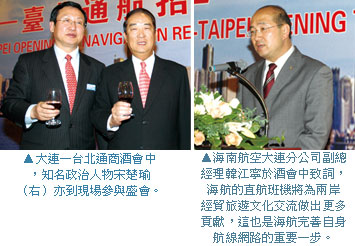 復興航空總經理田地也應邀出席酒會並指出,海航2008╱12╱20大連—松山首航之後,復興航空自2008╱12╱21起松山—大連直航,是台灣第一家直飛東北的航空公司,未來也會提供更多旅客所需的服務。