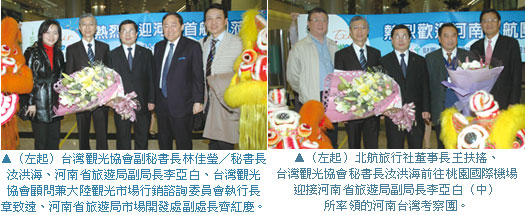 參訪團團長同時也是河南省旅遊局副局長李亞白表示,未來若能有效開闢直航,對於兩地人民的旅遊交流必能有長足的進步,同時不只是台灣旅客到河南旅遊,河南當地民眾也能來台旅遊,在雙向的旅遊市場上都將有莫大的幫助。河南有「中國歷史文化博物館」之稱,在中國八大古都中河南就佔了4個,更有近200處重點文物保護單位,館藏文物以及地下文物居中國之首,擁有極其豐富的旅遊資源,而其中鄭州為商代首都所在地,包括嵩山、少林寺、商城遺址等景點,加上交通發達,前往河南其他地區都相當便利,直航之後包裝行程內容上也將更為豐富。